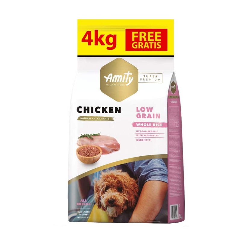 Amity Chicken Adult SP Low Grain es un alimento para perros adultos de todas las razas y tamaños formulado con pollo, arroz integral y verduras. Alimento hipoalergénico y Libre de GMO.