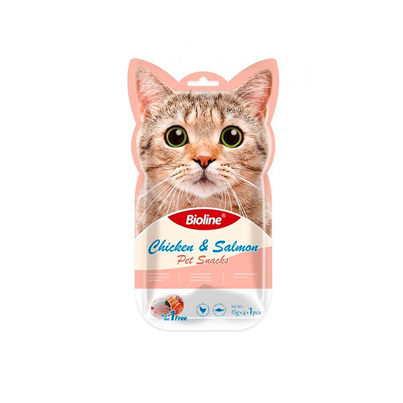 Bioline Cat Treats Chicken & Salmon es un snack cremoso, ideal para premiar a tu gatito elaborado de atún cola amarilla y rico en ácidos insaturados que mejoran la inmunidad, protegen el hígado y ayuda a mantener un cerebro saludable. El estado cremoso del Bioline Cat Treats Chicken & Salmon favorece la absorción de nutrientes, además su sabor puro es sumamente palatable y una experiencia culinaria que los gatos amaran.