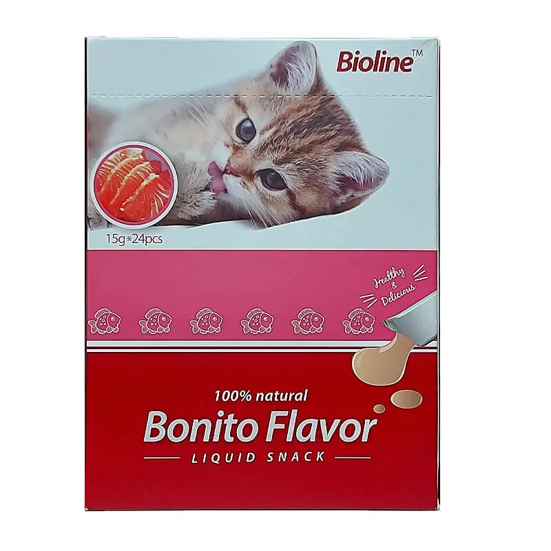 El Bioline Liquid Snack Bonito de 24 unidades(caja), como su nombre lo indica es un Snacks liquido para gatos, es elaborado con pez azul o Bonito y rico en ácidos insaturados que mejoran la inmunidad. Su estado liquido favorece la absorción de nutrientes. Su sabor puro es sumamente palatable y una experiencia culinaria que los gatos amaran. No contiene sabores artificiales, colorantes y conservantes. Libre de granos.