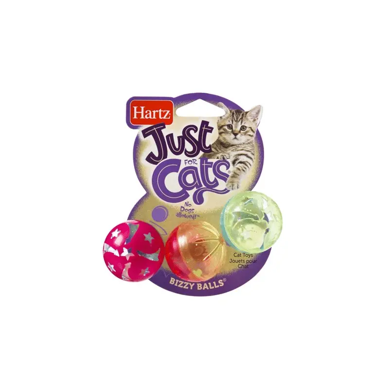 Las Bizzy Balls pelotas Just For Cats Hartz haran que el día de su gato se vuelva más emocionante y lleno de ejercicios. Este trío de coloridas pelotas cuenta con superficies texturizadas para un rodar errático que atraera los instintos de persecución y caza de tu gatito. Cada pelota contiene una campana tintineante para mantener a tu felino entretenido durante el juego en solitario o interactivo junto a mas gatitos.