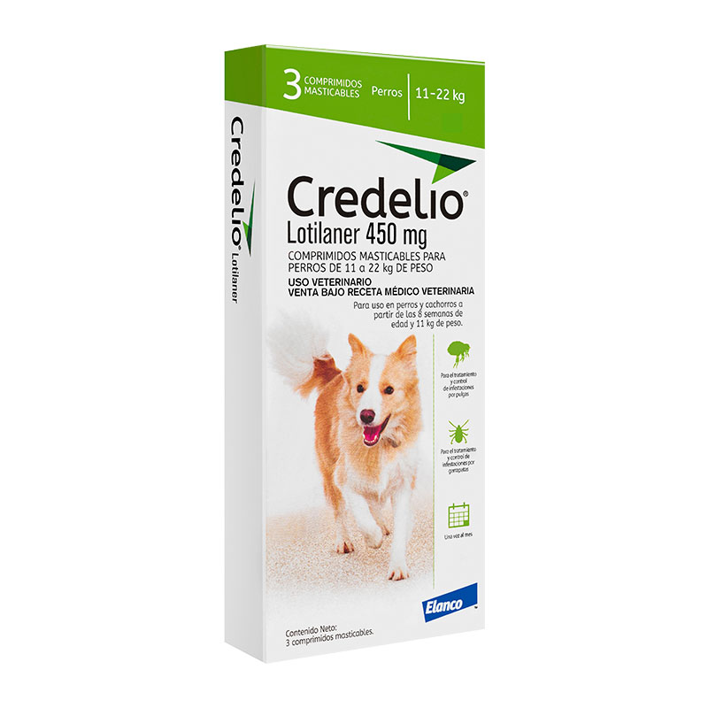 El Credelio 450mg x 3 es un antiparasitario ideal para perros de 11 a 22Kg. Es un sabroso y pequeño comprimido mensual, de fácil administración que actúa muy rápido y protege a los cachorros y perros de pulgas y garrapatas.