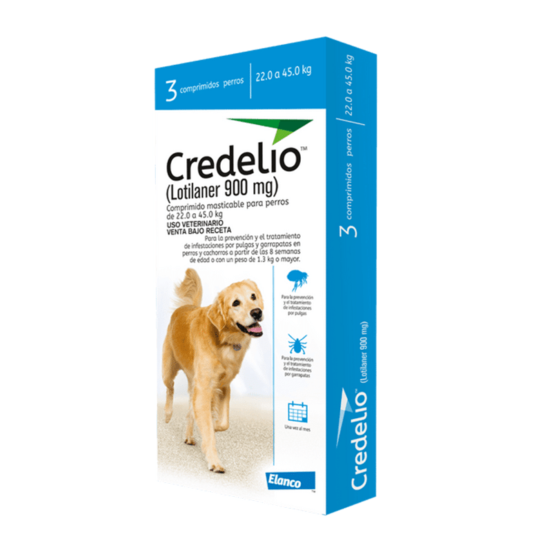 El Credelio 900mg x 3 es un antiparasitario ideal para perros de 22 a 45kg. Es un sabroso y pequeño comprimido mensual, de fácil administración que actúa muy rápido y protege a los cachorros y perros de pulgas y garrapatas.