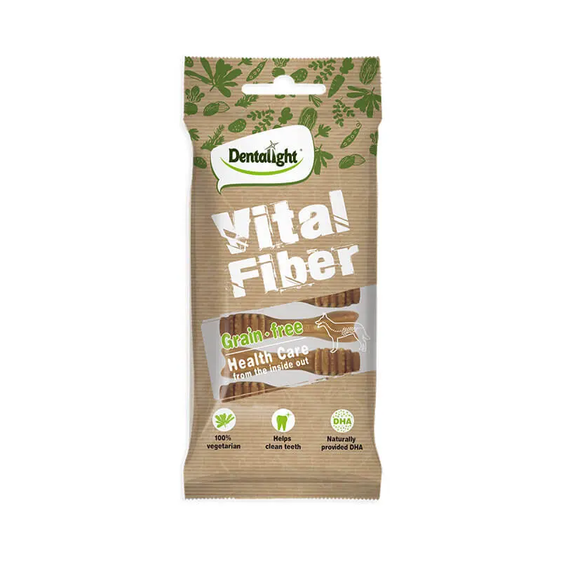 Dentalight Vital Fiber Brush variedad 100g son snack de fibra 100% vegetariano, en forma de cepillos para el cuidado de la salud desde adentro hacia afuera de su mascota. Las mejores golosinas para perro son a base de una nutrición enriquecida en fibra y vitaminas. De la misma manera las mejores marcas ayudan a la limpieza dental de tu pequeño amigo y son elaboradas de productos naturales.
