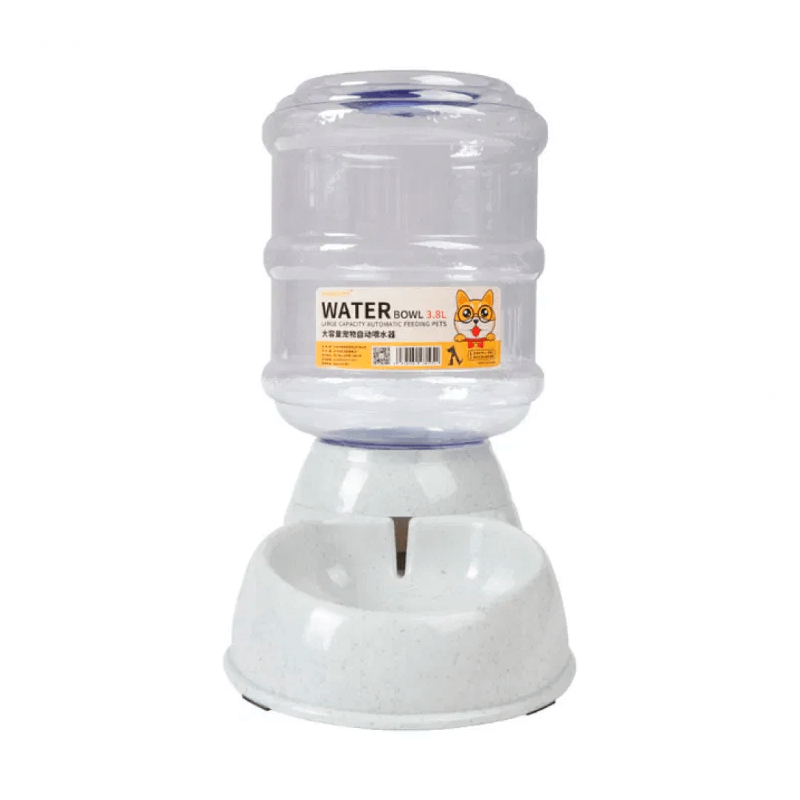 Dispensador de Agua 3.8L para perros almacena una gran cantidad de agua de 3,8 L y lo suministra de forma continua por gravedad. Es ideal para ofrecer a tu regalón una fuente constante de agua asegurándote de que no le falte en ningún momento.