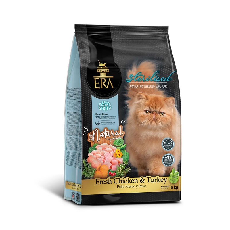 Alimento para gatos adultos con pollo y pavo. Su receta sin cereales es ideal para gatos intolerantes o alérgicos a ciertos ingredientes. ERA contiene ingredientes funcionales, un alto contenido de proteínas y vitaminas de alta calidad, además de probióticos y prebióticos. Todo esto convierte a este alimento en una dieta completa y equilibrada que le proporcionará a tu gato una buena condición física, tanto interna como externa.