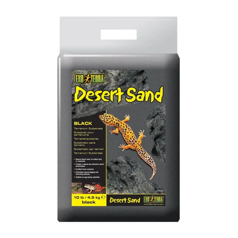 El Exo Terra Sustrato Desertico Negro consiste de arena natural del desierto a la cual no se le han añadido colorantes ni productos químicos. La arena ha sido tamizada para eliminar las impurezas y conseguir un grano de arena homogéneo en cuanto a su tamaño.