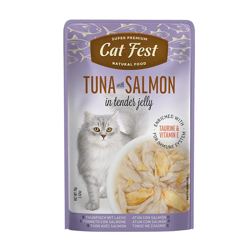 Mima a tu gato con el delicioso Cat Fest Atún con Salmón en Gelatina Suave. Una receta premium con 54% atún y 6% salmón, que ofrece proteínas de alto valor biológico y un sabor irresistible que conquistará incluso a los felinos más exigentes.