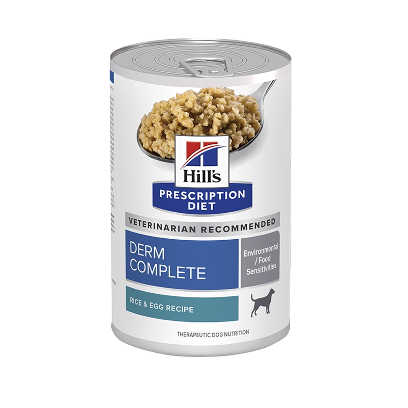 Hills Prescription Derm Complete Humedo 368 grs para perros adultos, ideal para piel sensible y alergias alimentarias, con proteína animal única y alto contenido en ácidos grasos esenciales.
