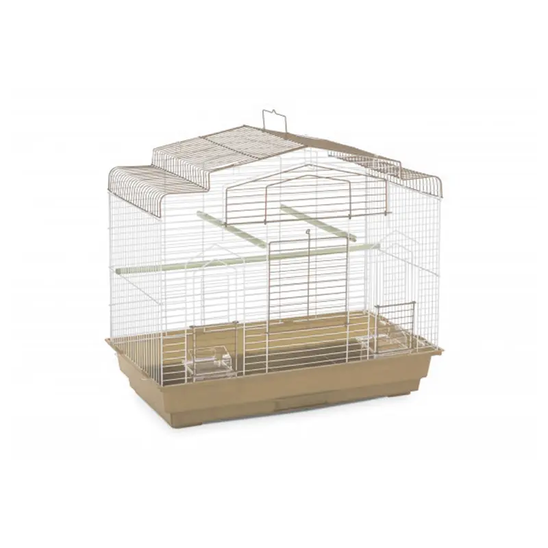 Jaula Chalet Ninfa Beige de techo tipo granero para mayor espacio de desplazamiento, gran puerta de apertura frontal para facilitar el acceso y aseo. Incluye rejilla inferior, bandeja extraíble que permiten una fácil limpieza