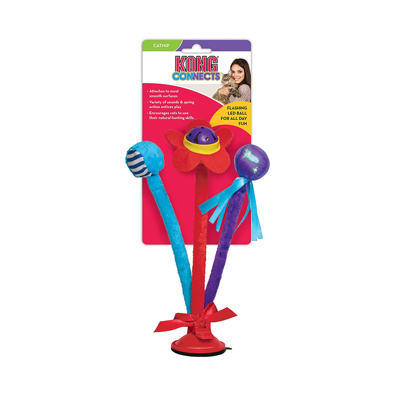 KONG Bat ’N Spring es 3 juguetes en 1, ofreciendo incluso a los mejores gatitos cazadores un desafío único. Adhiriéndose a la mayoría de superficies planas, la luz LED parpadeante de la pelota con cascabel proporciona una emocionante diversión, mientras que la hierba gatera y los sonidos traqueteantes estimulan el juego durante todo el día. Las cintas añaden una diversión adicional.