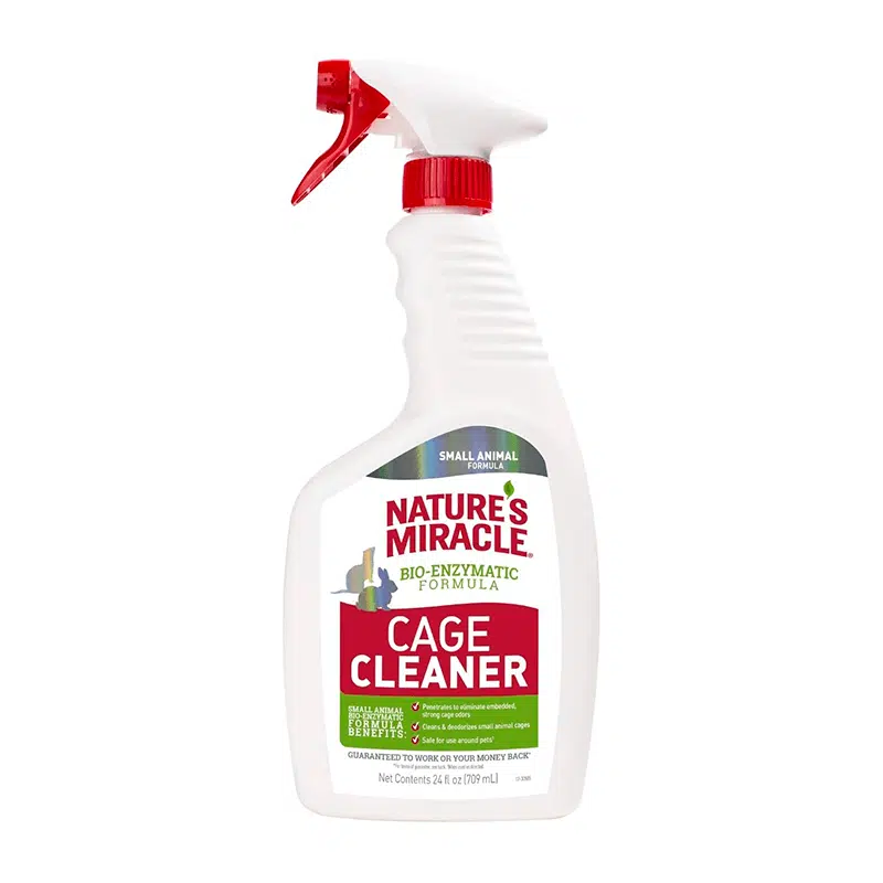 - Rocíe completamente el Limpiador de jaulas pequeños animales – Natures Miracles en el fondo y las paredes laterales de la jaula.