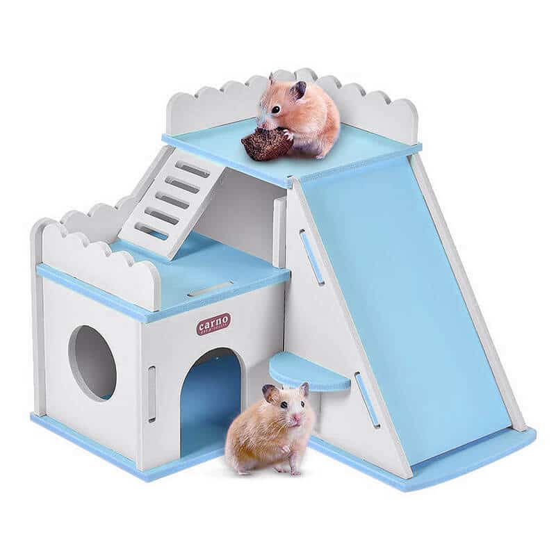 La Mansion Hamster Celeste con Resbalin destaca por su elegancia, y cuenta con puerta principal, ventana, escalera y resbalin para una máxima diversión.