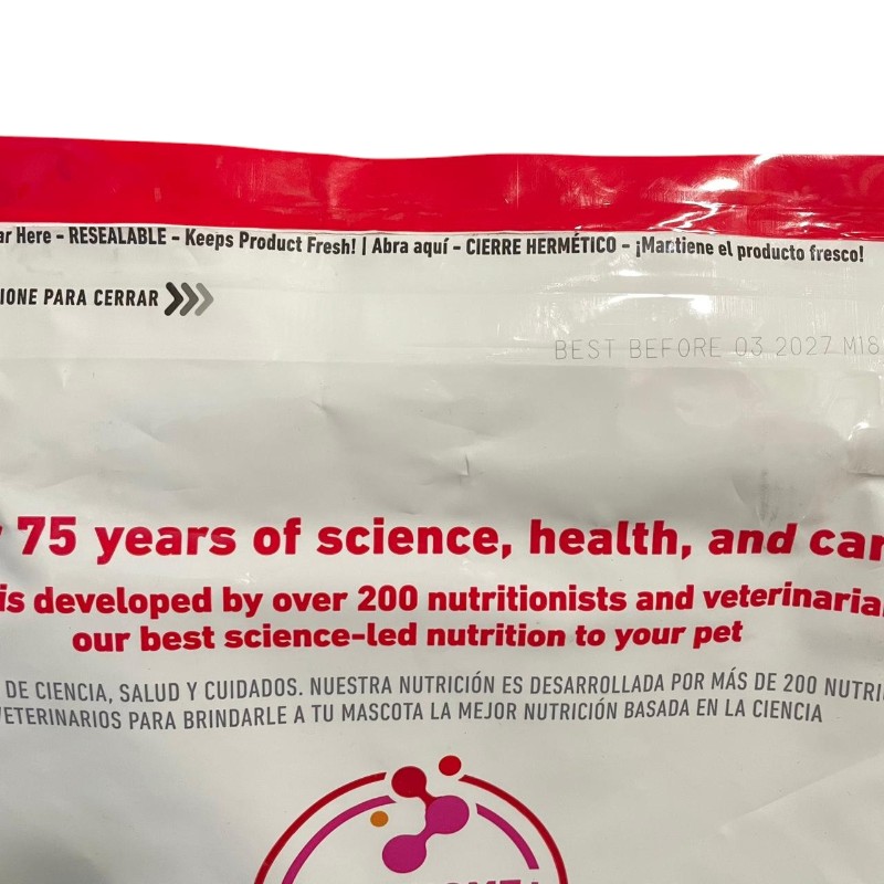 - Piel y pelaje sanos: Mezcla exclusiva de ácidos grasos omega-6, vitamina E y otros nutrientes que nutren la piel y promueven un pelaje notoriamente brillante.