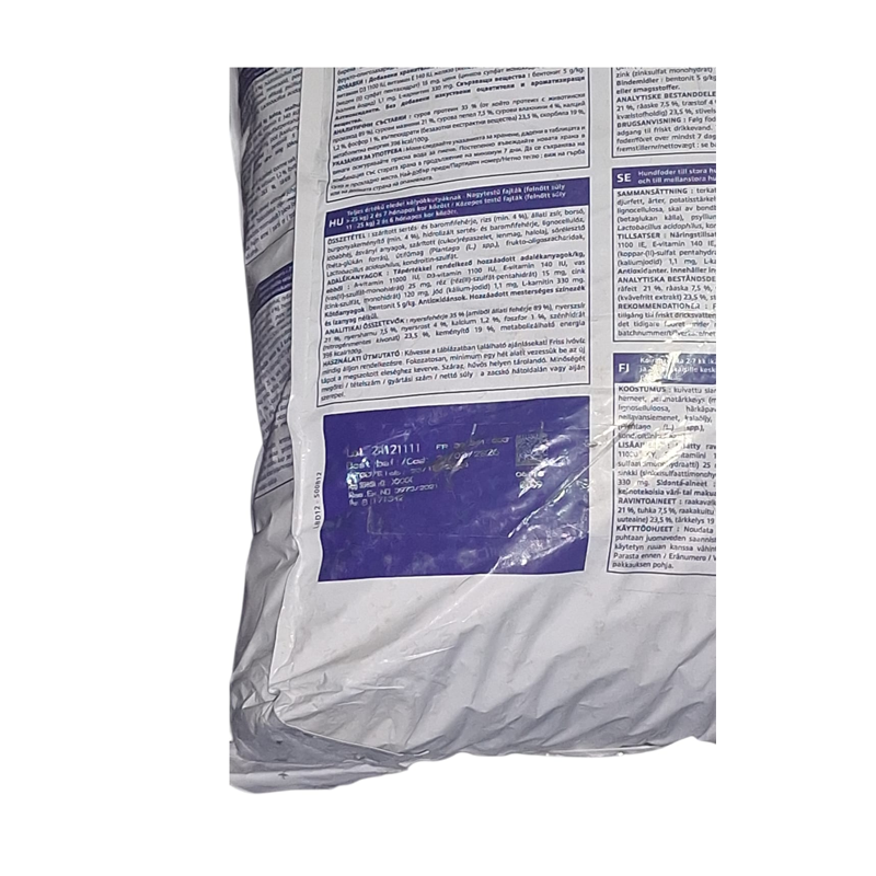 Proteínas de cerdo y de aves deshidratadas, arroz (min. 4 %), grasas animales, guisantes, almidón de patata (min. 4 %), proteínas de cerdo y de aves hidrolizadas, lignocelulosa, cáscaras de haba, sustancias minerales, pulpa de remolacha, semillas de lino, aceite de pescado, levadura de cerveza (fuente de betaglucano), fibra de psyllium (Plantago (L.) spp.), fructo-oligosacáridos, Lactobacillus acidophilus, sulfato de condroitina.