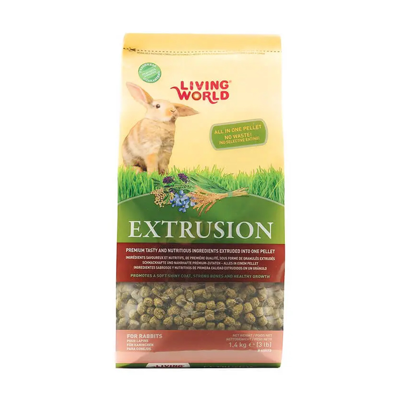 La comida viene en una bolsa de pie con una cremallera resellable para sellar su frescura. Living World Extrusion Diet también está disponible para hámsters y cobayas.