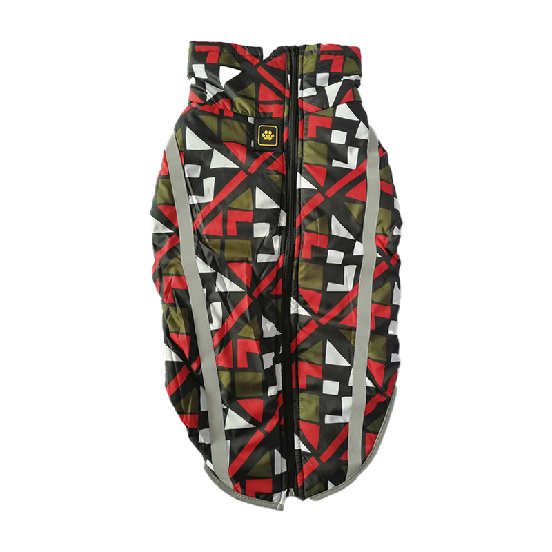Parka impermeable con interior de algodón S Abstracto Rojo, blanco y verde, es el abrigo ideal para tu mascota, para este invierno. Exterior impermeable para protegerlos de viento y lluvia. Con un diseño super original y bonito que le dará un toque distinto.