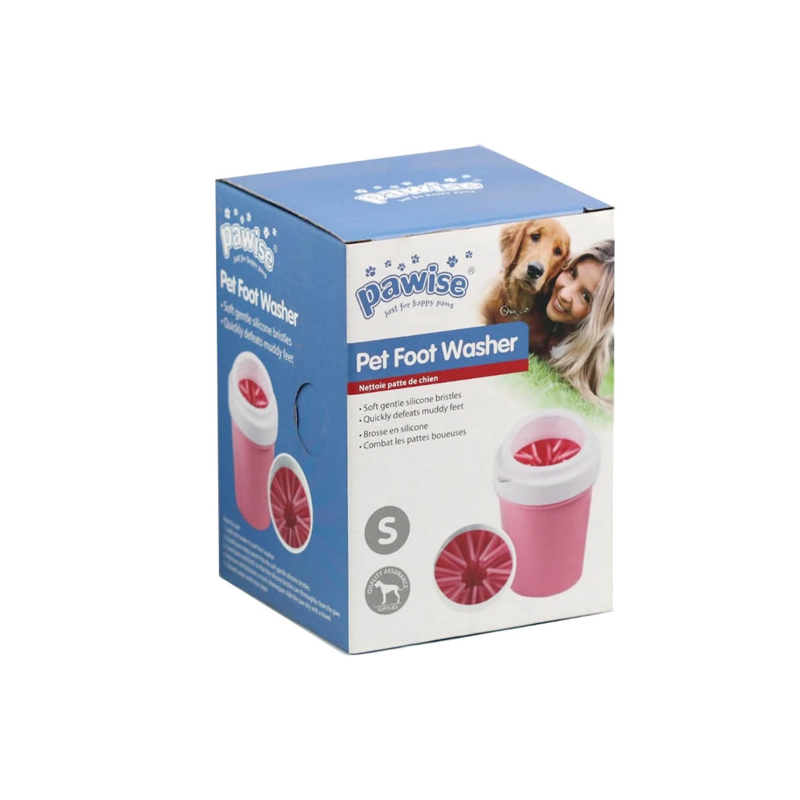 - Pawise Limpiador De Patitas S – Rosa: para usar, monta el Limpiador de patas Pawise, teniendo las cerdas en su interior, quedando un hueco para la pata en el centro del cilindro. Pon la tapa con rosca. Añade un poco de agua y jabón para mascotas.