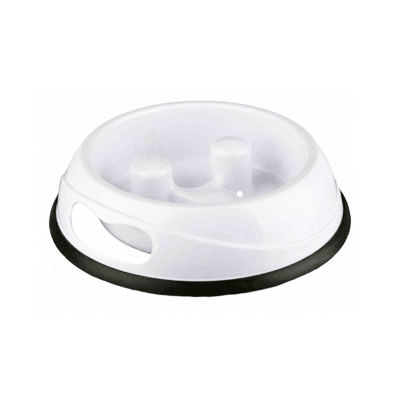 Plato de comida lenta Blanco 23cm -Trixie , es un plato para ralentizar el proceso de alimentación de tu perro y de esta manera evitar problemas digestivos. Con este alimentador para perros, su perro comerá a un ritmo más lento. Cuenta con un diseño circular.