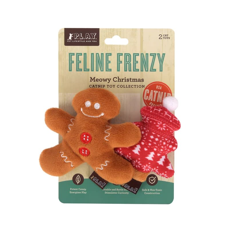 Alegra las fiestas de tu gato con el juego de juguete navideño PLAY JUGUETE FELINE FRENZY MEOWY CHRISTMAS. Estas delicias de hierba gatera orgánica certificadas por el USDA tienen formas festivas, hierba gatera orgánica y texturas irresistibles para horas de juego alegre.