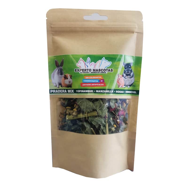 El nuevo Pradera Mix de la marca Paraizoo son unos deliciosos snacks 100% naturales, muy nutritivos y sin químicos añadidos, hechos con hojas y palitos de topinambur, rosas manzanilla e hibiscus. Es un snack ideal para cobayas, conejos, hámsters, jerbos, ratas y ratones.