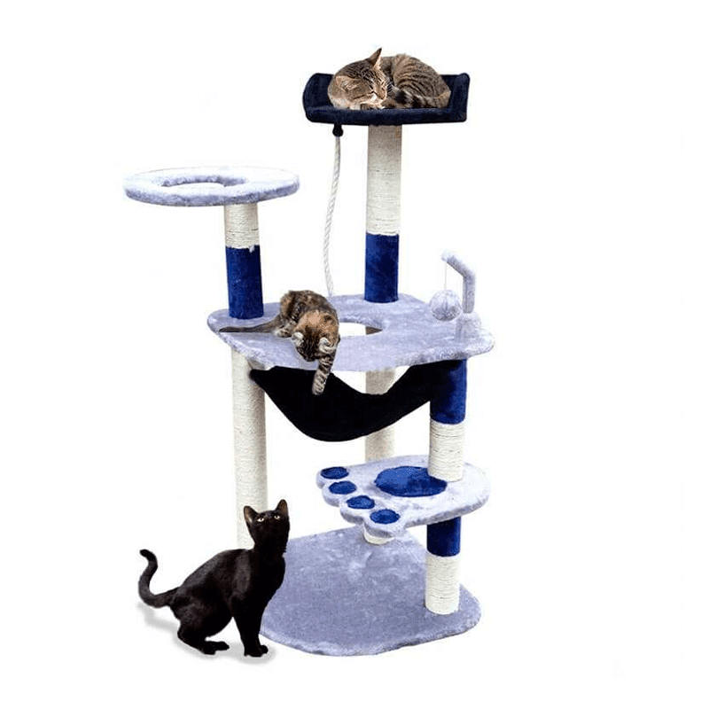 El Rascador Torre Gris/Azul – KF-8056 es un llamativo centro de entretención que cuenta con 5 niveles aptos para 2 o 3 gatos. Está compuesto por postes de cuerda de yute natural, plataformas, hamaca, una bola y cuerda de juguete, base y cama.