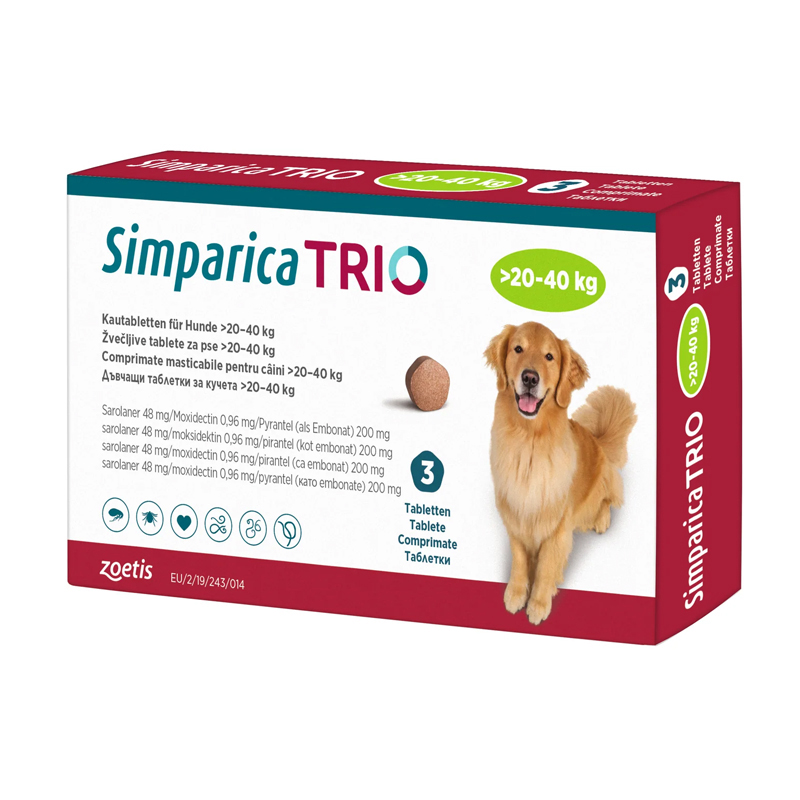 Simparica Trio 20 a 40 kg – 3 comprimidos es una tableta muy fácil de administrar, que tu peludo puede comer muy fácilmente, ¡si la prueba le encantará! Además, no es necesario dársela junto con alimento y es seguro para cachorros a partir de las 8 semanas de edad.