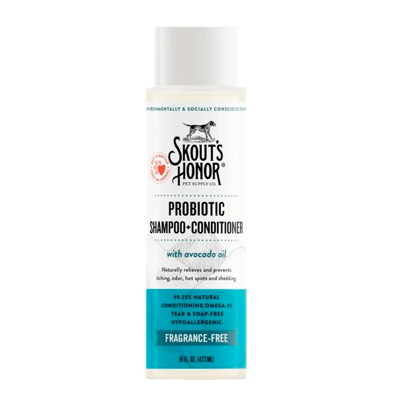 Shampoo+Conditioner Sin perfume 473 ml es un shampoo y acondicionador para perros y gatos que limpia e hidrata suavemente la piel y el pelaje, siendo recomendado tanto para mascotas sanas como para mascotas que sufren de alergias cutáneas. La fórmula de Skouts Honor Shampoo Acondicionador contiene aceite de palta y probióticos tópicos que ayudan a mantener un microbioma saludable de la piel de tu mascota para defenderse de los problemas comunes de la piel como picazón, olor, sequedad, caspa, puntos calientes, levadura y muda excesiva.