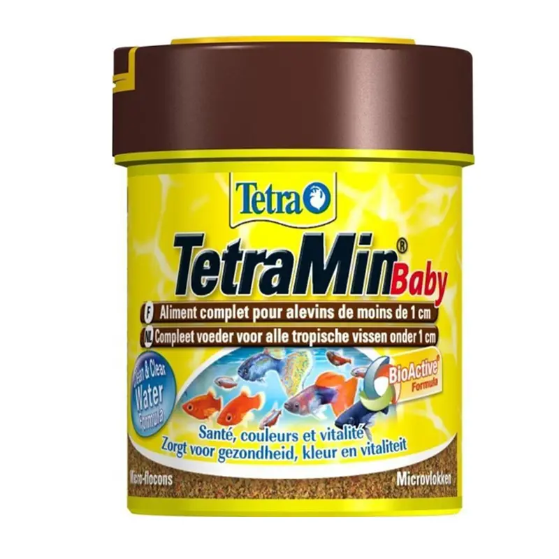 Tetra Min Baby es un alimento que está especialmente indicado para las crías de alevines tropicales de hasta 1cm de longitud, ya que es un tamizado extremadamente fino que incorpora un alto contenido proteico y está enriquecido con nutrientes fórmula BioActive que consta de una mezcla equilibrada de vitaminas esenciales, ingredientes con un gran aporte de energía e inmunoestimulantes que mejoran las funciones corporales y refuerzan la resistencia a las enfermedades de nuestros peces.