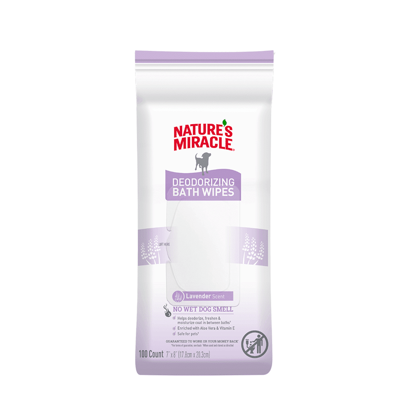 Las Toallitas desodorantes aroma lavanda de 100 unidades de la marca Nature’s Miracles dejan a la mascota limpia de forma veloz y con un aroma a lavanda. Su empleo suprime el mal olor.